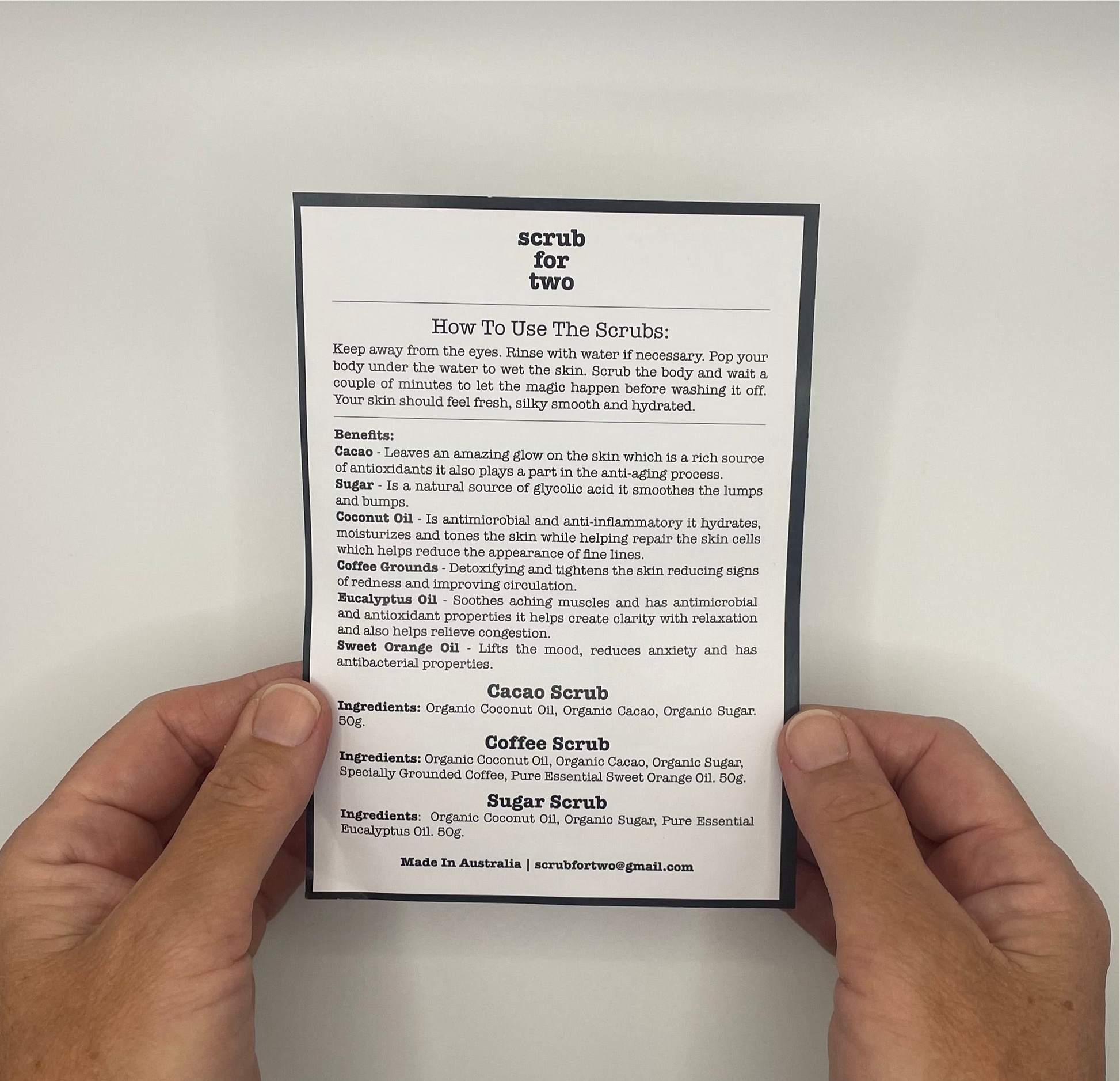 Ing - Organic Coconut Oil, Organic Sugar, Pure essential Eucalyptus Oil.